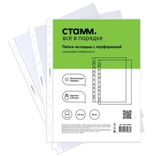 —Папка-вкладыш с перфорацией (файл) СТАММ А4, 110 мкм, глянцевая, (50 шт;уп), ММ-30987