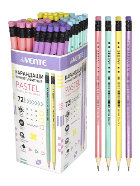 Карандаш чернографитный 'deVENTE. Pastel' HB, диаметр грифеля 2 мм, шестигранный, с ластиком, заточенный, цвета корпуса ассорти в пастельных тонах, индивидуальная маркировка, в картонной коробке с микроперфорацией