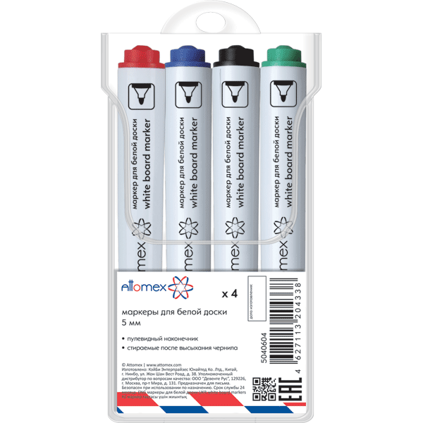 —Набор маркеров для белой доски 'Attomex', 4 цв, 5 мм, круглый корпус , пулевидн. наконечник, 5040604
