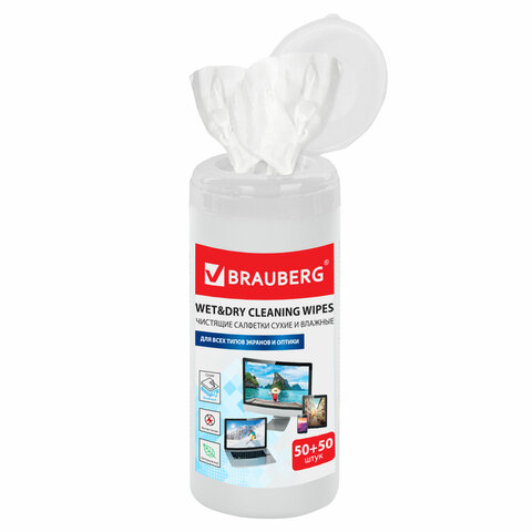 Салфетки для экранов всех типов и оптики BRAUBERG, 13х17 см, туба (100 шт), влажные, 510122