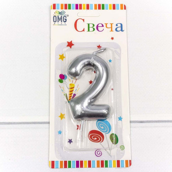 —Свеча для торта 'Цифра 2. Серебряный', OMG, 6 см, картон. уп., европодвес, ОМ-20014;2